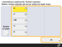 Jeśli wciśniesz klawisz <Aut.>, musisz ręcznie wybrać format papieru. W sytuacji, kiedy nie zostanie wybrany formatu papieru, urządzenie automatycznie dobierze wielkość kopia/oryginał do formatu papieru znajdującego się aktualnie w szufladzie numer 1.