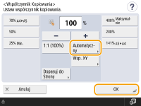 Podczas kopiowania z równym współczynnikiem kopiowania na papierze o takim samym rozmiarze, co oryginał, krawędzie obrazu na kopii mogą zostać nieznacznie obcięte. Aby tego uniknąć, zmniejsz rozmiar obrazu, naciskając po kolei opcje <Współczynnik Kopiowania>