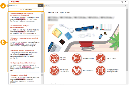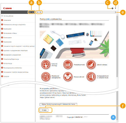 Kliknięcie tego elementu powoduje wyświetlenie instrukcji dotyczących otwierania Podręcznik użytkownika, wyszukiwania oraz innych informacji.