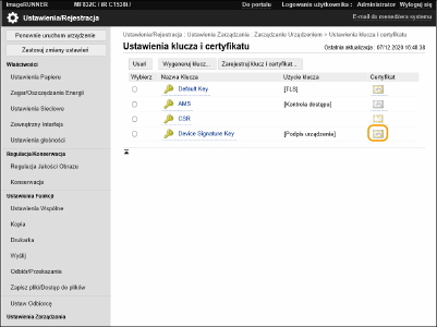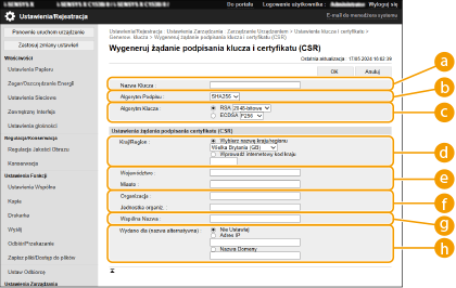 Certyfikaty wygenerowane za pomocą tego urządzenia nie posiadają podpisu CA, co może skutkować błędami komunikacji z niektórymi urządzeniami. Aby żądać certyfikatu z podpisem CA, niezbędne są dane żądania podpisania certyfikatu (CSR). Wyłącznie administratorzy mogą generować CSR.