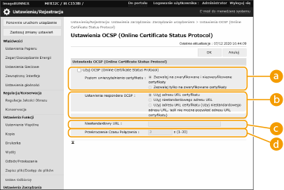 Istnieją dwie metody weryfikacji ważności certyfikatów otrzymanych od drugiej strony w komunikacji: Porównanie z listą unieważnionych certyfikatów (CRL) zarejestrowaną w urządzeniu i zapytanie respondera (serwera obsługującego protokół OCSP) OCSP (Online Certificate Status Protocol). Ustaw metodę sprawdzania ważności certyfikatów stosowanie do używanego środowiska. Tę operację może wykonać tylko administrator.