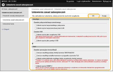 Jeżeli zmieniono jakiekolwiek ustawienia urządzenia, gdy obowiązywały zasady bezpieczeństwa, nie można tak po prostu odznaczyć danego pola i przywrócić poprzednio wprowadzonych wartości. Aby zmienić te ustawienia, należy skorzystać z przycisku (Ustaw./Rejestr.) lub interfejsu Remote UI (Zdalny interfejs użytkownika).