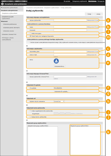 „Nazwa grupy” zarejestrowana w zarządzaniu grupą użytkowników jest zapisana tutaj. Jeśli użytkownik należy do wielu grup, nazwy grup są połączone przy pomocy „I”.