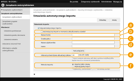 Możesz określić interwał w minutach w celu kontroli pliku, który ma być importowany.
