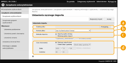 Wykonując pełen import, dowolny użytkownik niewymieniony w importowanych plikach jest usuwany z urządzenia. Jednakże, „-----” i „Administrator” które są domyślnie rejestrowane pozostaną, nawet jeśli nie są wymienione w importowanych plikach.