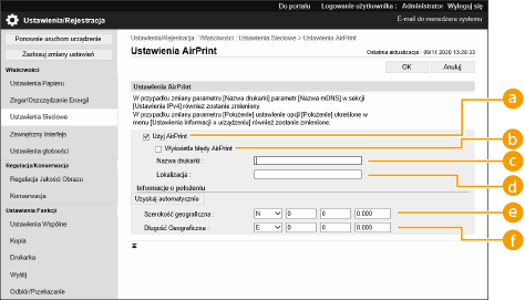 Możliwa jest rejestracja informacji, takich jak nazwa urządzenia oraz lokalizacja instalacji, które posłużą do identyfikacji urządzenia. Ustawienia niezbędne do działania technologii AirPrint mogą zostać skonfigurowane na odległość za pośrednictwem interfejsu Remote UI (Zdalny interfejs użytkownika).