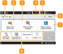 W tym obszarze wyświetlany jest stan ustawień, takich jak tryb kolorów i rozmiar skanowania. Aby poprawnie zeskanować oryginał, należy sprawdzić ustawienia. Aby zmienić ustawienia, należy nacisnąć odpowiedni przycisk.