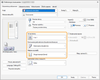Sprawdzając podgląd wydruku, ustaw kolejno opcje [Układ strony] [Kolejność stron] [Drukowanie jednostronne/dwustronne/broszura] [Miejsce szycia].
