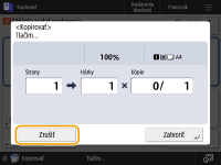 (Stop) na ovládacom paneli, keď sa zobrazuje obrazovka základných funkcií kopírovania, úloha kopírovania sa pozastaví a zobrazí sa hlásenie <StopVyberte kopír. úlohu, ktorú chcete zrušiť.> a zoznam úloh kopírovania. Môžete vybrať úlohu kopírovania zo zoznamu a zrušiť ju stlačením tlačidla <Zrušiť>.Ak sa prihlásite so správou osobného overovania a odhlásite sa po stlačení tlačidla