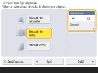 Ak sa formát zobrazený v poli <Veľ. originálu> líši od formátu originálu, stlačte tlačidlo <Zmeniť> a vyberte formát. Režim vymazania rámu originálu môžete nastaviť iba pre originálne formáty zobrazené na displeji dotykového panela.