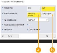 Vyberte položku <10BASE-T>, <100BASE-TX> alebo <1000BASE-T> v ponuke <Typ siete Ethernet>.