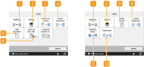 Zobrazí stav nastavenia, ako napríklad formát papiera na tlač a počet výtlačkov. Nezabudnite potvrdiť nastavenia s cieľom zaistiť správne vytlačenie. Ak chcete zmeniť nastavenia, stlačte tlačidlo pod časťou na zobrazovanie. Ak chcete zmeniť počet výtlačkov, zadajte požadovaný počet pomocou číselných tlačidiel.