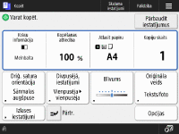 (Sākums). Ekrānā <Sākums> tiek parādīts funkciju pogu un darbību saraksts, no kura var piekļūt dažādām funkcijām. Ekrānā <Sākums> parādītie vienumi