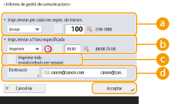 No podeu configurar els paràmetres de l'Informe de gestió de comunicacions mentre <Mostrar registre de treballs> a <Opcions de gestió> està establert en <Off>. A més, si canvieu <Mostrar registre de treballs> a <Opcions de gestió> de <Off> a <On>, <Impr./enviar per cada nre. espec. de transm.> i <Impr./enviar a l'hora especificada> a l'informe de gestió de comunicacions canvia automàticament a <Off>. <Mostrar registre de treballs>