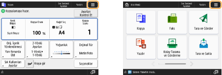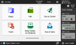 <Ana Menü> ekranında kopyalama, fakslama ve tarama gibi temel fonksiyonlara erişebileceğiniz Temel Özellikler ekranını görüntülemek için fonksiyon düğmelerine basın. Temel Özellikler ekranındaki ekran ve ayar öğeleri fonksiyonlara bağlı olarak farklılık gösterse de ayarları gereksinimlerinize uyacak şekilde değiştirebilirsiniz. Temel Özellikler Ekranının Özelleştirilmesi