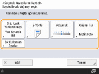 <Sık Kull. Ayarlar> seçeneğinde kaydetme<Sık Kull. Ayarlar> seçeneğinde kopyalamaya yönelik olarak sık kullanılan prosedürlerin yanı sıra taramaya yönelik olarak sık belirtilen hedefler ve ayarlar da kaydedebilirsiniz. Daha fazla bilgi için bkz. Sık Kullanılan Fonksiyonlar Birleşiminin Kaydedilmesi.