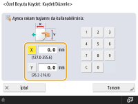 <X> tarafının ve <Y> tarafının uzunluğunu belirtin. Sayı tuşlarını kullanarak her bir kenarın uzunluğunu girmek için <X> veya <Y> seçeneğine basın.