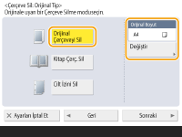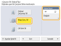 <Orijinal Boyut> bölümünde gösterilen boyut kitabın boyutundan farklıysa, boyutu seçmek için <Değiştir> seçeneğine basın. Kitabın Çerçevesini Silme modunu sadece dokunmatik panel ekranda gösterilen orijinal boyutları için ayarlayabilirsiniz.