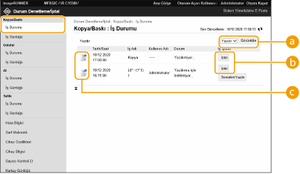 İşlenmeyi bekleyen belgelerin durumunu ve işlenmiş belgelerin günlüklerini denetlemek için Uzak Kullanıcı Arabirimi'ni kullanabilirsiniz. Ayrıca, hata bilgileri ve kalan sarf malzemesi miktarı gibi makine durumu bilgilerini denetleyebilirsiniz.