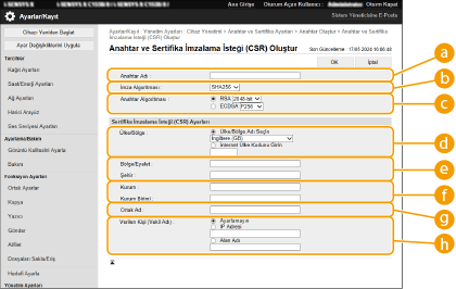 Makine üzerinde bir anahtar ve CSR oluşturabilirsiniz. Ayrıca, CSR verilerini ekranda görüntüleyebilir ve dosya olarak aktarabilirsiniz.