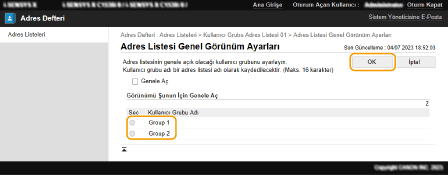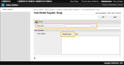 Ayrıca, Uzak Kullanıcı Arabirimi'nden hedefleri kaydetmek/düzenlemek için yalnızca Administrator ayrıcalıklarına sahip kullanıcıları etkinleştirerek Kullanıcı Grubu Adres Listelerini yönetebilirsiniz. <Kullanıcı Grup Adres Listesi Kullan>