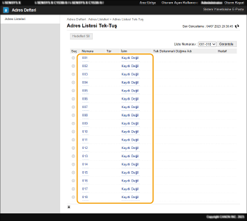 Hedefin kaydedileceği adres listesine tıklayın ([Kişisel Adres Listesi], Kullanıcı Grubu Adres Listeleri, [Adres Listesi 01] - [Adres Listesi 10] veya [Yöneticiler için Adres Listesi]).