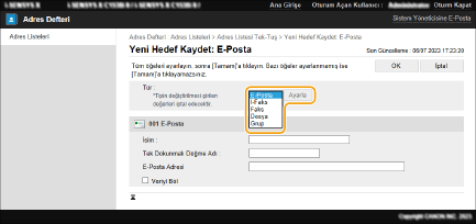 [Yöneticiler için Adres Listesi] yalnızca Administrator veya DeviceAdmin ayrıcalıklarıyla oturum açan yöneticiler tarafından kullanılabilir.