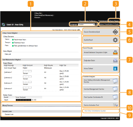 Makineyi çalıştırmak için Uzak Kullanıcı Arabirimi kullanılırken web tarayıcısının [Geri] düğmesini kullanmayın. [Geri] düğmesini kullanırsanız sayfa doğru şekilde değiştirilemeyebilir.