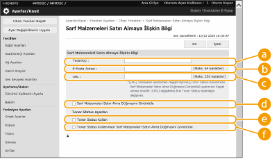 Uzak Kullanıcı Arabirimi'nden sarf malzemeleri bilgileri kontrol edilirken görüntülenen, sarf malzemeleri satın almak için web sitesine bir bağlantı ayarlayabilirsiniz. Web sitesine bir bağlantı oluşturmak, kullanıcıların sarf malzemeleri satın almasını kolaylaştırır.