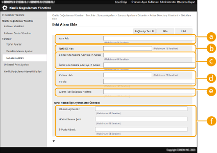Oturum açma hedefine ait Aktif Dizin bilgilerinin otomatik olarak alınacağını veya manuel olarak girileceğini belirleyin. Manuel olarak girmek için [Manüel Ayarla] seçeneğini belirleyin ve oturum açma hedefinin alanını [Active Directory Yönetimi...] bölümüne ekleyin.