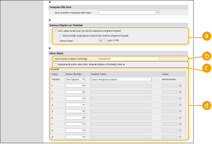 Kumanda paneli üzerinden oturum açan kullanıcıların kimlik doğrulama bilgilerini kaydetmek için onay kutusunu seçin. Klavye kimlik doğrulaması ile oturum açan kullanıcıların bilgilerini önbelleğe kaydetmek için [Klavye kimlik doğrulaması kullanılırken kullanıcı bilgilerini kaydet] onay kutusunu işaretleyin. Ayarlar yapılandırıldıktan sonra, makine sunucuya bağlanamasa bile kayıtlı kimlik doğrulama bilgileri oturum açma için kullanılabilir. Gerektiğinde [Tutma Süresi:] ayarını değiştirin.