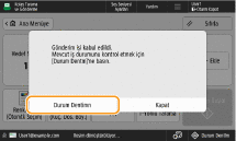 <İş Kabul Edildiğinde Bildirim Görüntüle> seçeneği <Açık> olarak ayarlandığında, bir gönderim işi alındıktan sonra gösterilen aşağıdaki ekranda <Durum Dentlm> ekranı görüntülenebilir. <İş Kabul Edildiğinde Bildirim Görüntüle>