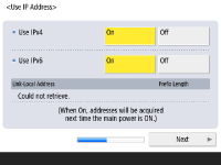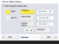 برای تنظیم خودکار آدرس IP، انتخاب برای <DHCP> یا <Auto IP> را پاک کنید، و <IP Address>، <Subnet Mask>، و <Gateway Address> را فشار دهید تا هر مقدار را وارد کنید، و <Next> یا <OK> را فشار دهید.