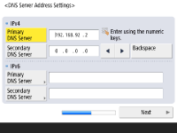 <Primary DNS Server> و <Secondary DNS Server> را فشار دهید، و آدرس IPv4/IPv6 را برای سرور DNS وارد کنید و <Next> را فشار دهید.