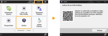 Εάν πατήσετε την επιλογή <Βοήθεια>, εμφανίζεται ένας κωδικός QR. Εάν σαρώσετε αυτόν τον κωδικό QR με μια φορητή συσκευή, όπως ένα smartphone ή ένα tablet, μπορείτε να αποκτήσετε πρόσβαση στη σελίδα του Οδηγού Χρήστη για αυτήν τη συσκευή.