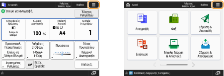 Στην οθόνη <Αρχική>, πατήστε τα πλήκτρα λειτουργιών για να εμφανιστεί η οθόνη βασικών λειτουργιών, από την οποία μπορείτε να αποκτήσετε πρόσβαση σε βασικές λειτουργίες όπως αντιγραφή, αποστολή φαξ και σάρωση. Παρόλο που η οθόνη και τα στοιχεία ρύθμισης στην οθόνη βασικών λειτουργιών διαφέρουν ανάλογα με τις λειτουργίες, μπορείτε να αλλάξετε τις ρυθμίσεις ώστε να εξυπηρετούν καλύτερα τις ανάγκες σας. Προσαρμογή της οθόνης βασικών λειτουργιών