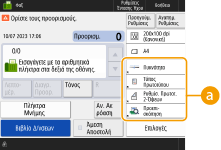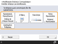 Μπορείτε να αλλάξετε τα πλήκτρα ρυθμίσεων που εμφανίζονται στις οθόνες βασικών λειτουργιών (για αντιγραφή, φαξ και σάρωση) με άλλα πλήκτρα ρυθμίσεων στο <Επιλογές>. Με τον εντοπισμό των συχνά χρησιμοποιούμενων πλήκτρων ρυθμίσεων στην οθόνη βασικών λειτουργιών, μπορείτε να χρησιμοποιήσετε τις λειτουργίες πιο αποτελεσματικά. Επιπλέον, πραγματοποιώντας σύνδεση με διαχείριση ατομικής πιστοποίησης, μπορείτε να εμφανίσετε μια διαφορετική οθόνη βασικών λειτουργιών, προσαρμοσμένη για κάθε χρήστη.