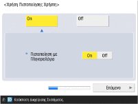 Για χρήση της πιστοποίησης μέσω καταχώρισης με αριθμητικά πλήκτρα μόνο στην οθόνη σύνδεσης, πατήστε <On> και, στη συνέχεια, πατήστε <OK>.