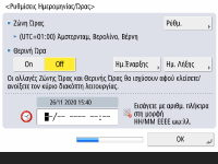 Ρυθμίστε το <Ζώνη Ώρας> και το <Θερινή Ώρα> όπως απαιτείται. Για περισσότερες πληροφορίες, ανατρέξτε στην ενότητα Ρύθμιση ημερομηνίας και ώρας.