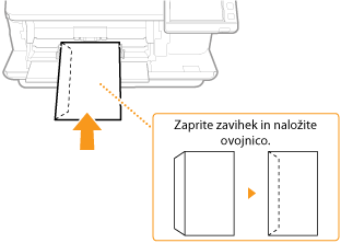 Kuverte vložite v kaseto za papir ali večnamenski pladenj. Pri tiskanju na kuverte poravnajte zavihke, preden jih naložite, da ne bi prišlo do zagozditve papirja ali gub. Pazite tudi na pravilno usmerjenost kuvert in na stran, ki je obrnjena navzgor.