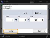 (Ustavi) na nadzorni plošči, ko so postopki kopiranja na čakanju, se vsi postopki kopiranja začasno ustavijo, nato pa se prikažeta sporočilo <StopIzberite opravilo kopiranja, ki ga želite preklicati.> in seznam postopkov kopiranja. Na seznamu lahko izberete postopek kopiranja in postopek prekličete s pritiskom <Preklic>. Če želite nadaljevati kopiranje, pritisnite <Nadalj. kopir.>. |