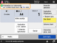 Prikazuje stanje nastavitve, kot sta velikost papirja za tiskanje in število izpisov. Za pravilno tiskanje potrdite nastavitve. Za spreminjanje nastavitev pritisnite gumb pod zaslonom. Za spremembo števila izpisov vnesite število s številskimi tipkami.