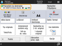 Prikaže stanje nastavitve, kot sta ločljivost in velikost optičnega branja. Za pravilno optično branje potrdite nastavitve. Za spreminjanje nastavitev pritisnite gumb pod zaslonom. Če želite več informacij o formatih datoteke, glejte Sistemske možnosti.