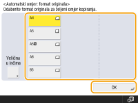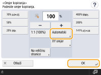 Ako podesite <Auto>, potrebno je ručno odabrati veličinu papira. Ako ne odaberete veličinu papira, omjer kopiranja se automatski podešava tako da odgovara veličini papira uloženog u ladicu 1.