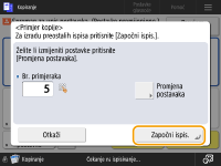 Pritisnite <Započni ispis.> da biste ispisali broj kopija koje ste odredili. Ako odaberete <Sve stranice> u 5. Koraku, ispisuje se broj kopija minus 1. Ako odaberete <Definirane stranice> u 5. koraku, ispisuje se ukupan broj kopija.