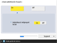 Pritisnite <Uključeno> za <Koristi korisničku autentikaciju>, pritisnite <Uključeno> za metodu prijave koju želite koristiti i zatim pritisnite <Dalje>.