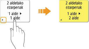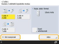 Konfigurazio-egoera bistaratzen da, hala nola kopia-erlazioa, kopiatzeko papera eta kopia kopurua. Ezarpen bat aldatu nahi duzunean, hautatu aldatu nahi duzun elementua.