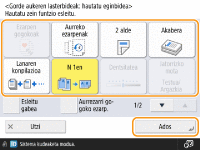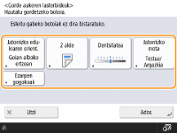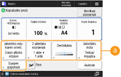 Aldatu egin ditzakezu oinarrizko eginbideen pantailetan (kopiatze, fax eta eskaneatzeko) bistaratutako ezarpen-botoiak beste ezarpen-botoi batzuen bidez <Aukerak>-(e)n. Sarritan erabilitako ezarpen-botoiak oinarrizko eginbideen pantailan jarriz, eraginkortasun handiagoz erabil ditzakezu funtzioak. Horretaz gain, autentifikazio pertsonaleko kudeaketarekin saioa hasiz oinarrizko eginbideen pantaila desberdina bistara dezakezu, pertsonalizatua erabiltzaile bakoitzarentzat.