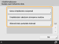 Makina konfiguratuta badago abiatzen denean erabiltzaileei saioa has dezaten eskatzeko (Saioa hasteko orria noiz bistaratzea adieraztea), <Hasiera-pantaila/berrezartze lehenetsia> elementu gisa bistaratuko da <Ezarpen pertsonalak>-(e)n. Makina abiatu ostean bistaratzen den pantaila ezarri egin daiteke erabiltzaile bakoitzarentzat.