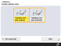 Oinarrizko kopiatze funtzioen pantailan <Aukerak>  <Lanaren konpilazioa> sakatzeak tartekatze/taldekatze funtzioak erabiltzea baimentzen dizu, nahiz eta originala beiraren gainean kokatuta egon.